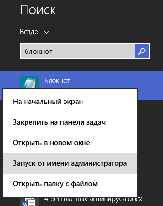 Запустіть програму блокнот від імені адміністратора. У Windows 10 це можна зробити через пошук (в пошуку на панелі завдань) блокнота і подальший правий клік по ньому. У Windows 7 знайдіть його в меню пуск, клікніть по ньому правою кнопкою миші і виберіть пункт «Запустити від імені адміністратора». У Windows 8 на початковому екрані почніть набирати слово «Блокнот» (так, просто почніть набір). Коли ви побачите список, в якому буде знайдена потрібна програма, клікніть по ній правою кнопкою миші і виберіть пункт «Запуск від імені адміністратора».