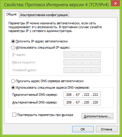 Для зміни DNS на одному комп'ютері, в Windows 7 і Windows 8 зайдіть в центр управління мережами і загальним доступом, в списку ліворуч виберіть пункт «Зміна параметрів адаптера». Потім клікніть правою кнопкою миші по підключенню, використовуваному для виходу в Інтернет і виберіть пункт «Властивості». Потім в списку компонентів підключення виберіть TCP / IPv4, натисніть «Властивості» і вкажіть DNS, вказаний на сайті OpenDNS: 208.67.222.222 і 208.67.220.220, потім натисніть «Ок».
