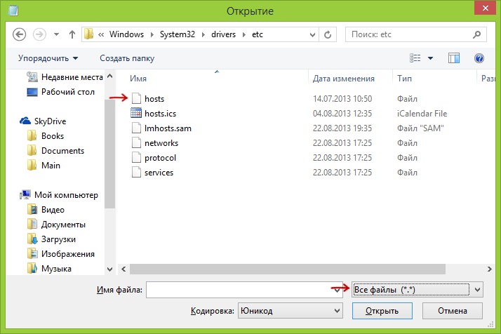 У блокноті, в меню виберіть Файл - Відкрити, пройдіть в папку C: Windows System32 drivers etc, поставте відображення всіх файлів в блокноті і відкрийте файл hosts (той, який без розширення).