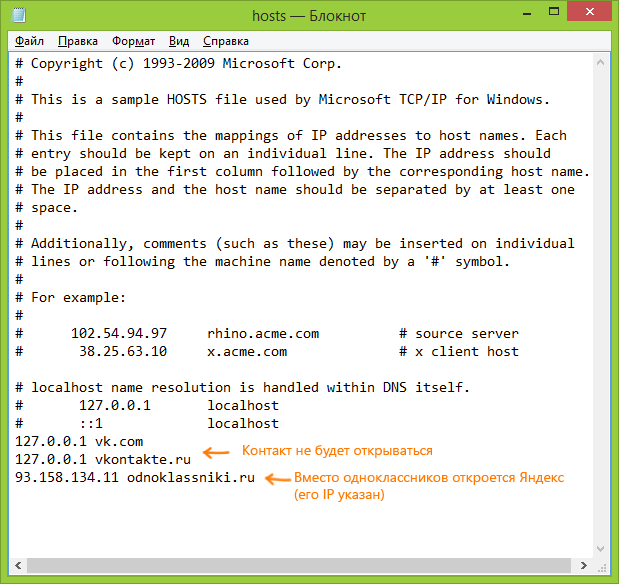 Додайте рядки для сайтів, які потрібно заблокувати із зазначенням адреси 127.0.0.1 і звичайного літерного адреси сайту без http. У цьому випадку, після збереження файлу hosts, даний сайт відкриватися не буде. Замість 127.0.0.1 можна використовувати відомі вам IP адреси інших сайтів (між адресою IP і літерним URL повинен бути мінімум один пробіл). Краще створити два рядки для кожного сайту - з www і без.